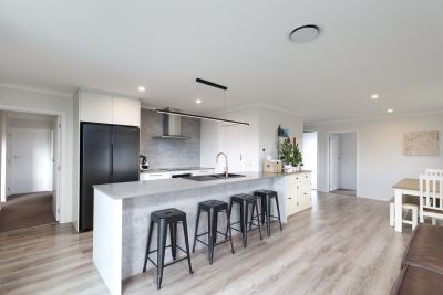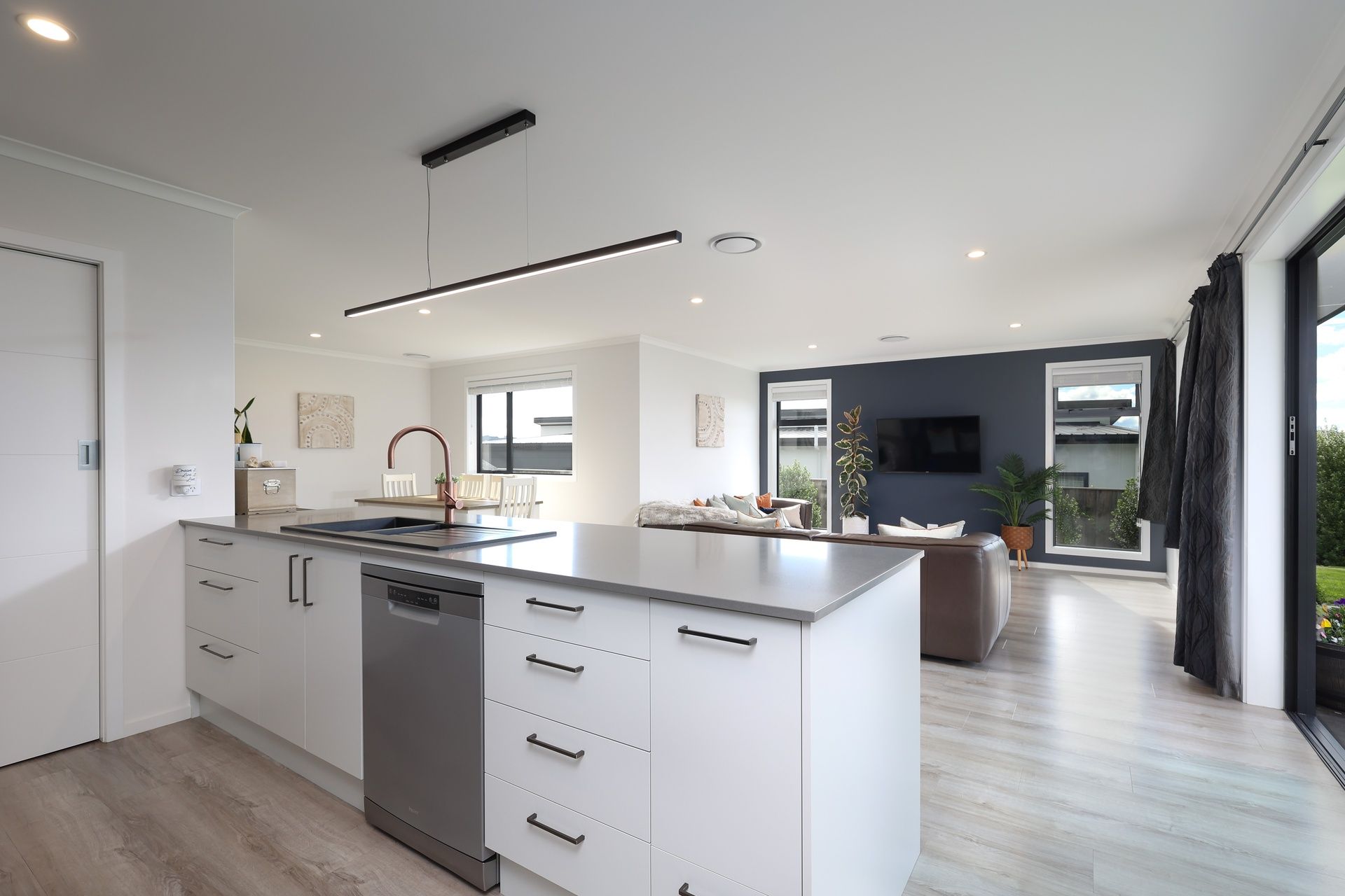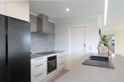 North-facing and bathed in all-day sun, the light-filled open-plan layout creates a warm and inviting space. The sleek contemporary kitchen forms the heart of the home with engineered stone benchtops, a stylish island breakfast bar, quality appliances including an induction cooktop, and a walk-in pantry - all designed for effortless entertaining.