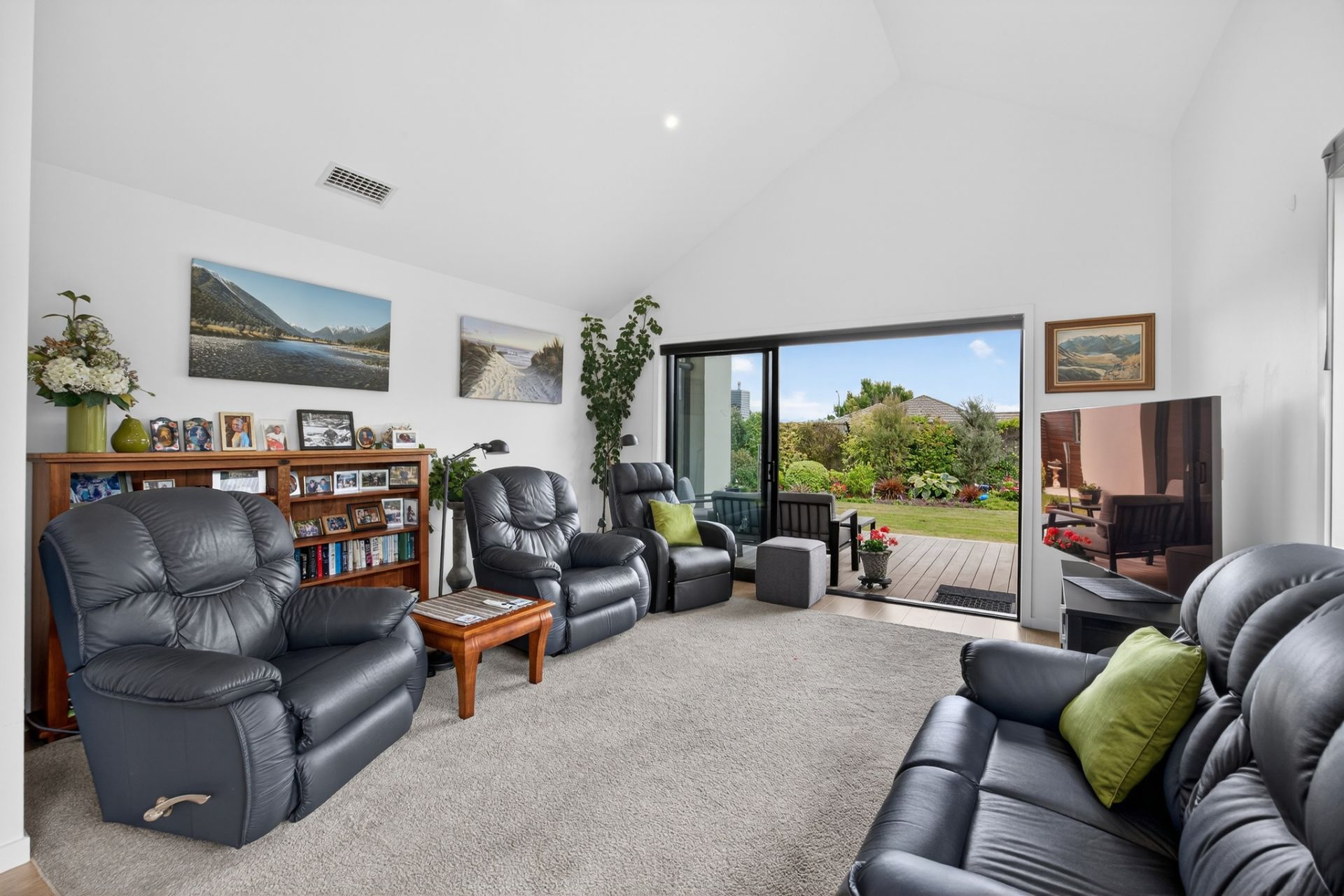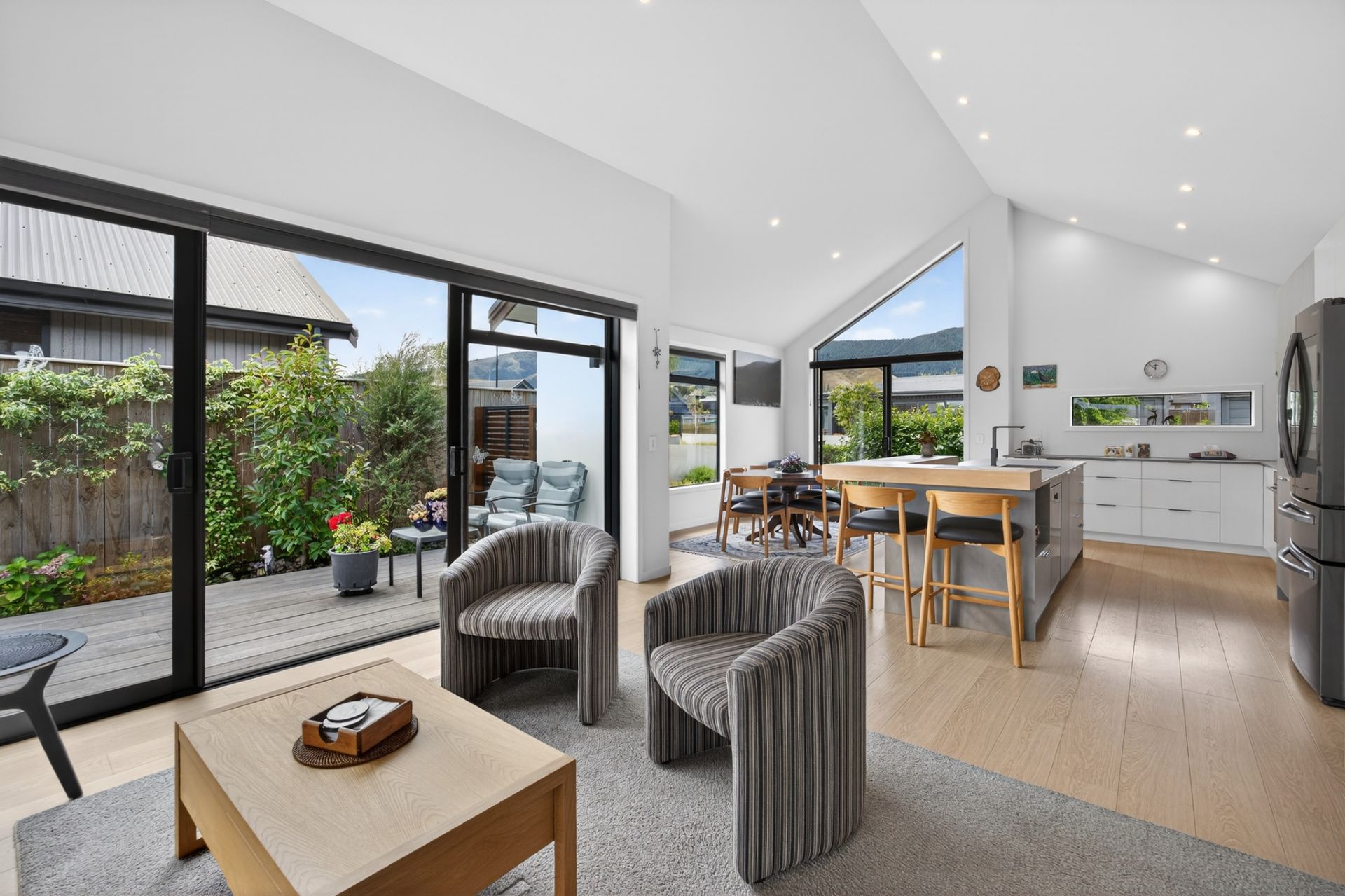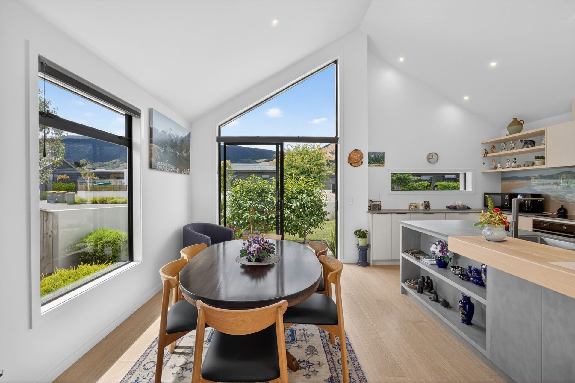 Designed for both relaxation and entertaining, the open-plan living areas are bathed in natural light, enhanced by vaulted ceilings and multiple glass sliders that connect effortlessly to the outdoors. A striking angular window adds architectural interest while capturing elevated views across the Richmond Hills.