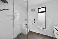Three generous double bedrooms provide comfortable accommodation, including a spacious master with walk-in wardrobe, stylish ensuite, and sliders opening to a private deck. The main bathroom is complemented by a separate toilet with vanity.
